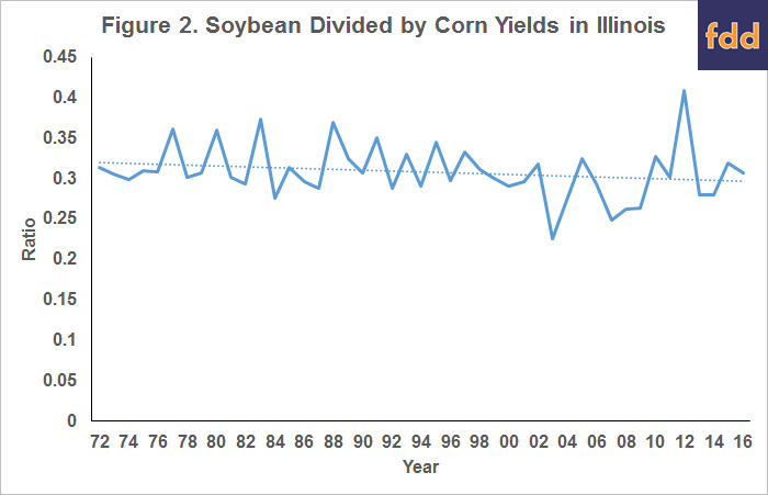 Soybean yields have been declining relative to corn yields because of higher trends for corn. In Illinois, corn yields have been increasing by 1.8 bushels per year compared to .48 bushels per year for soybeans. Over time, the higher increase in corn yields causes lower soybean-to-corn yields
