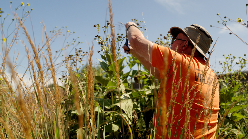 John Bodensteiner demonstrates seed saving techniques, focusing on the partridge pea, a native plant with beautiful yellow flowers.