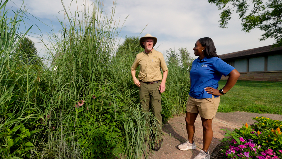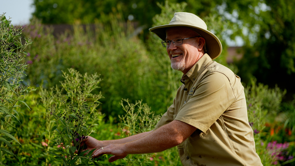 Rusty Maulding, site superintendent at Lake of the Woods shows us around the gardens. Rusty explains “late summer garden editing” as a seasonal process of tidying, rebalancing, and redirecting garden growth. He begins with an ironweed plant—tall, beautiful, but prone to encroaching on pathways. He shows how to decide whether a plant should be left in place, transplanted, or removed entirely. Next, he addresses big bluestem grass, noting that while valuable in prairie restoration, it can overwhelm smaller garden spaces if left unchecked.