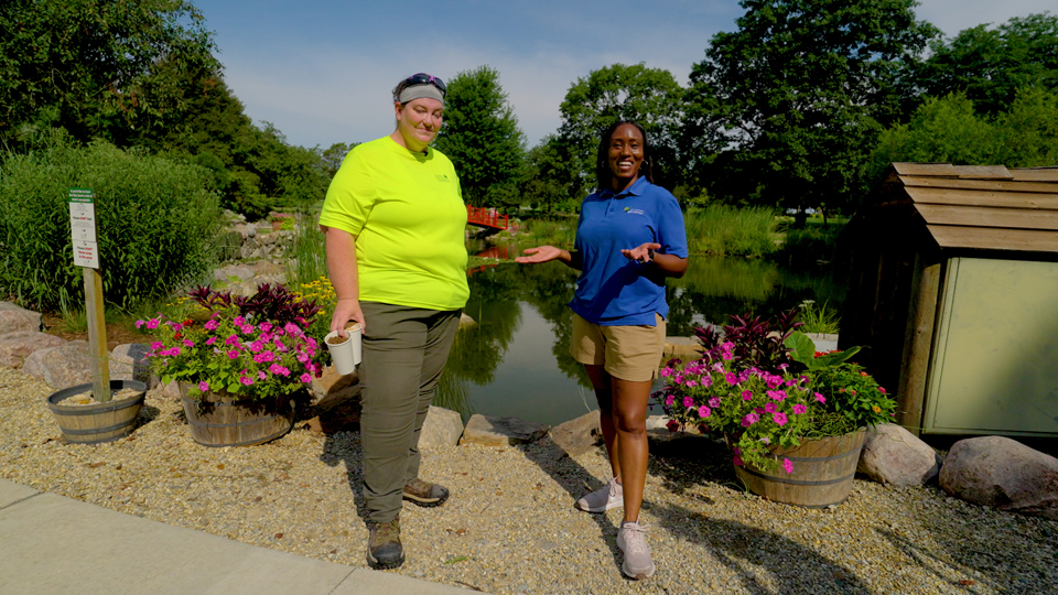 Tinisha then meets Stephanie Workman to talk about water features, starting with a lush koi pond inside the park for guests to enjoy.. Stephanie explains how to select aquatic and marginal plants—like cattails and native flowers—that thrive in constant moisture. She stresses the importance of shaded areas to help regulate pond temperature, and highlights filtration maintenance, monitoring water loss from evaporation, and managing leaks. Stephanie notes the cultural significance of koi in Japan and explains their winter dormancy (torpor), along with how to feed them.