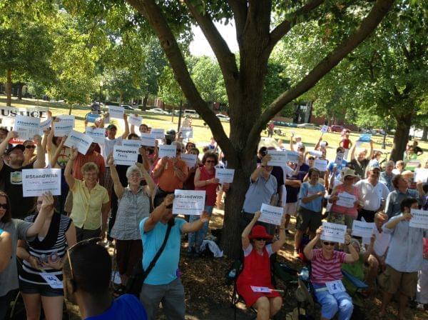 A crowd holds up signs at an immigration rally in Champaign on Aug. 31, 2013. (Sean Powers/WILL)