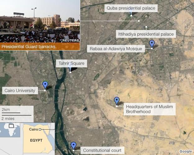 Mr Morsi is believed by the Muslim Brotherhood to be held at the barracks, but the military says he is elsewhere.