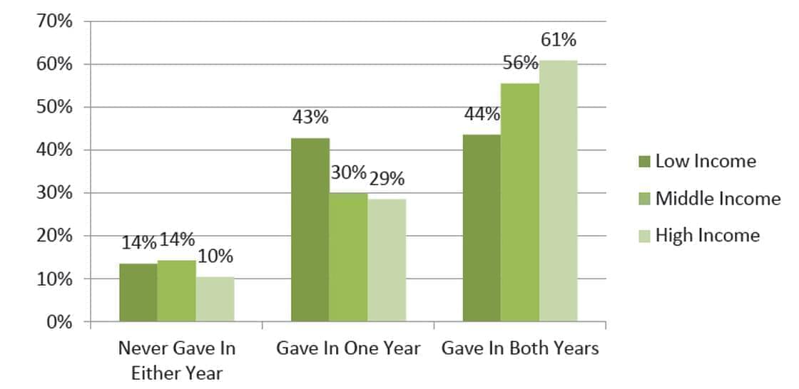 Percentage of American kids who gave to charity in 2002 and 2007, broken down by family income. When other factors are considered, socioeconomic status doesn't affect a kid's likelihood to give. (Courtesy of the U.N. Foundation)
