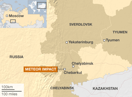 The meteor's dramatic passing was witnessed in Yekaterinburg, 200km (125 miles) to the north, and in Kazakhstan, to the south.
