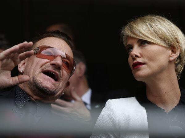 Actress Charlize Theron speaks with musician Bono before the memorial service for former South African president Nelson Mandela. (Ben Curtis/AP)