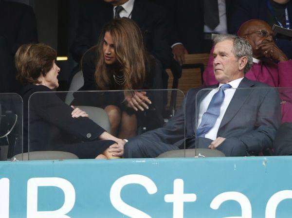 Princess Letizia of Spain, center, speaks with Laura Bush and Former U.S. President George W. Bush during the memorial service for former South African president Nelson Mandela. (Matt Dunham/AP)