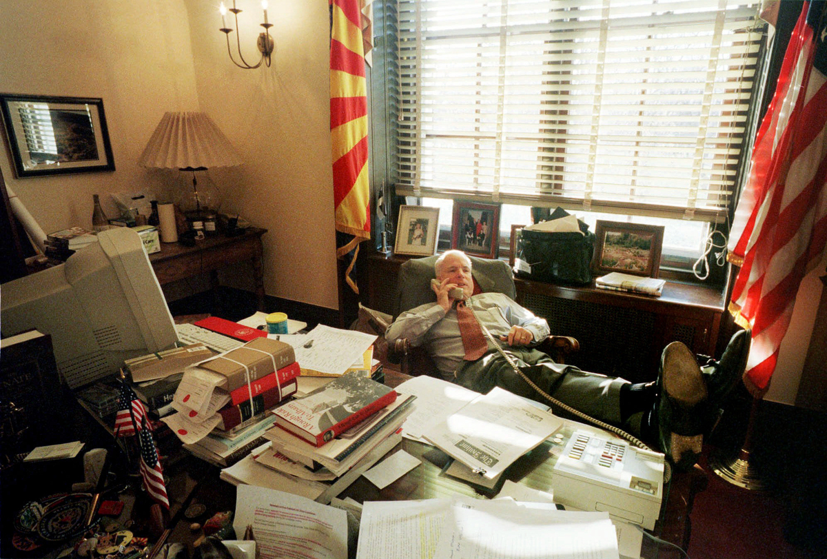 McCain makes a phone call while working in his Capitol Hill office during the Senate debate of the McCain-Feingold campaign finance reform bill in March 2001. McCain tackled the system of campaign financing with like-minded Democrats, an issue that split him from Republican leaders.